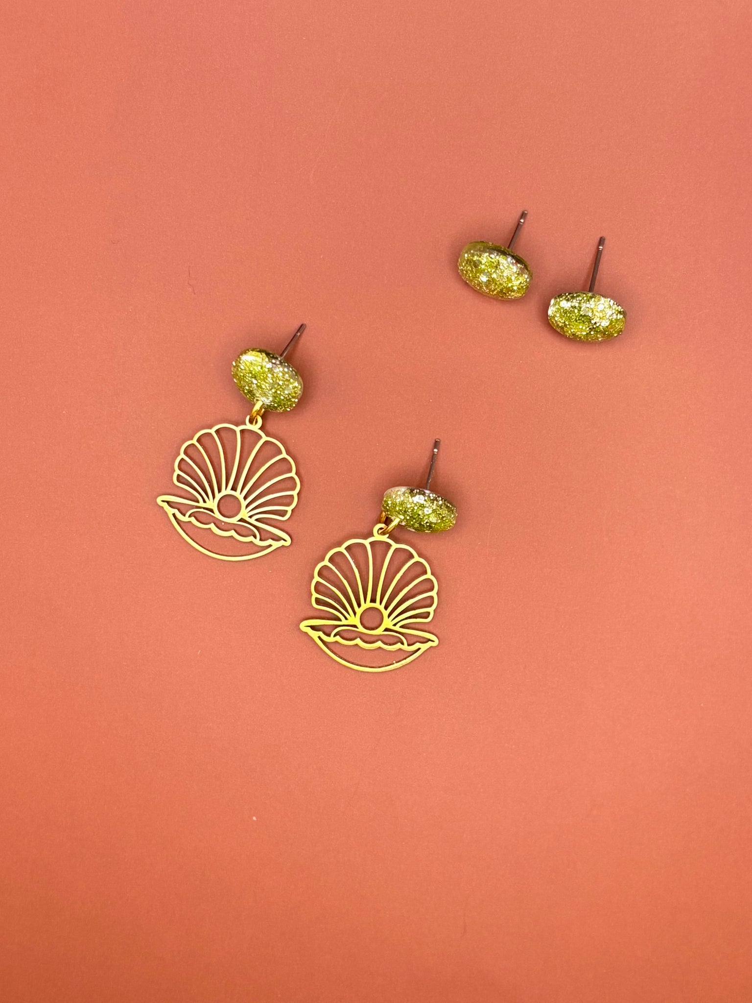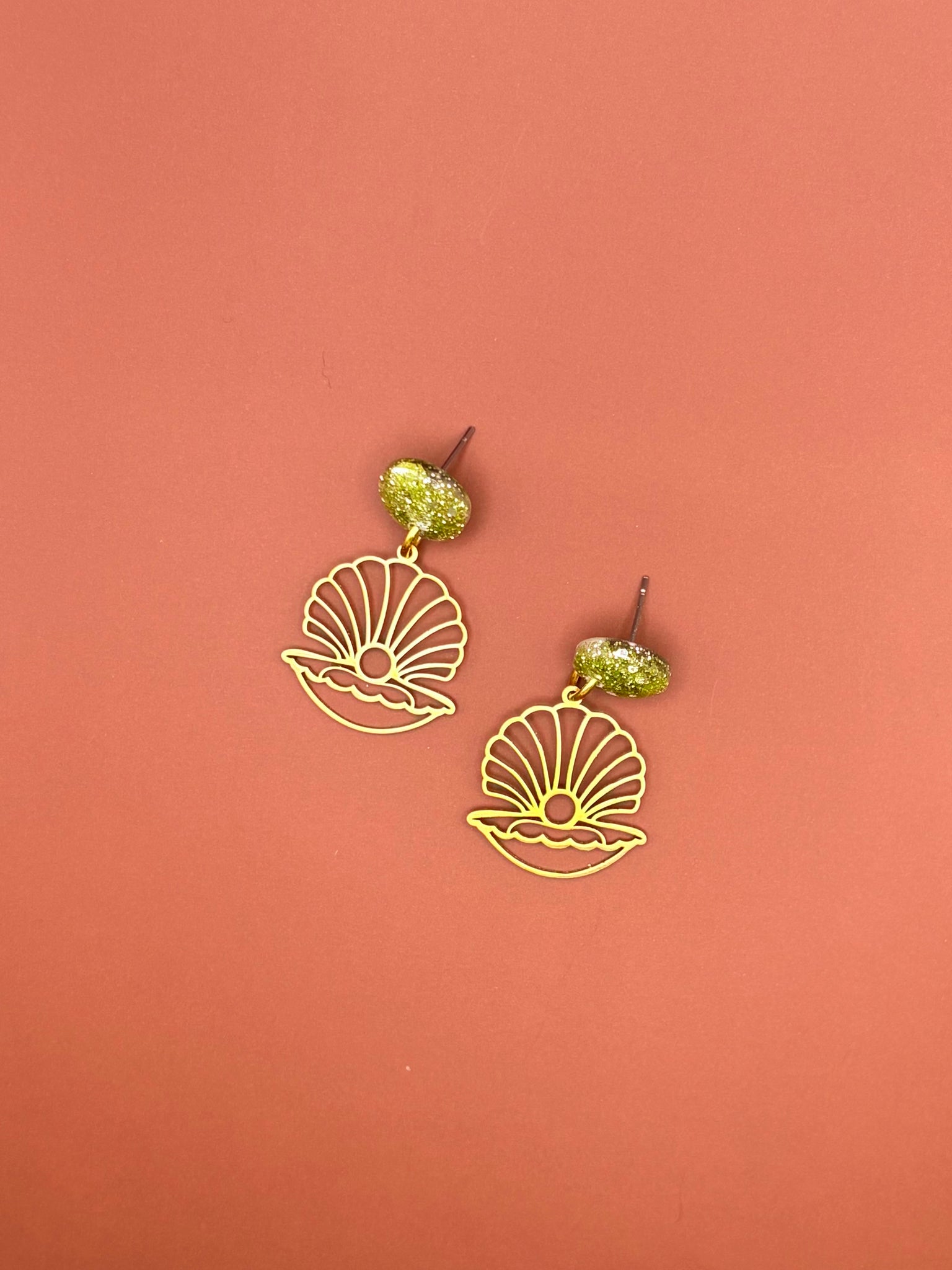 Shimmering gold glitter meets brass sea shells in these stunning earrings! With a perfect mix of sparkle and seaside charm, they add a touch of glamour and a whole lot of fun to any look.
