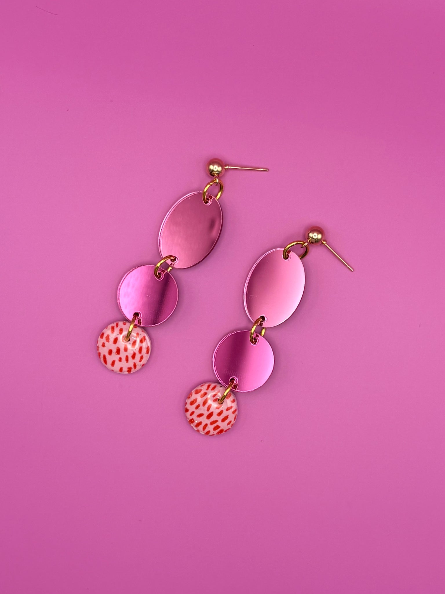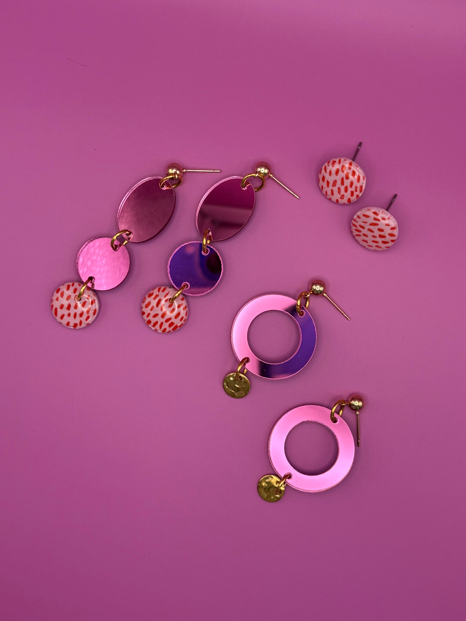 Bold, fun, and fabulously pink! These earrings are all about making a statement with their vibrant pink hues. Perfect for adding a pop of colour and personality to your look.