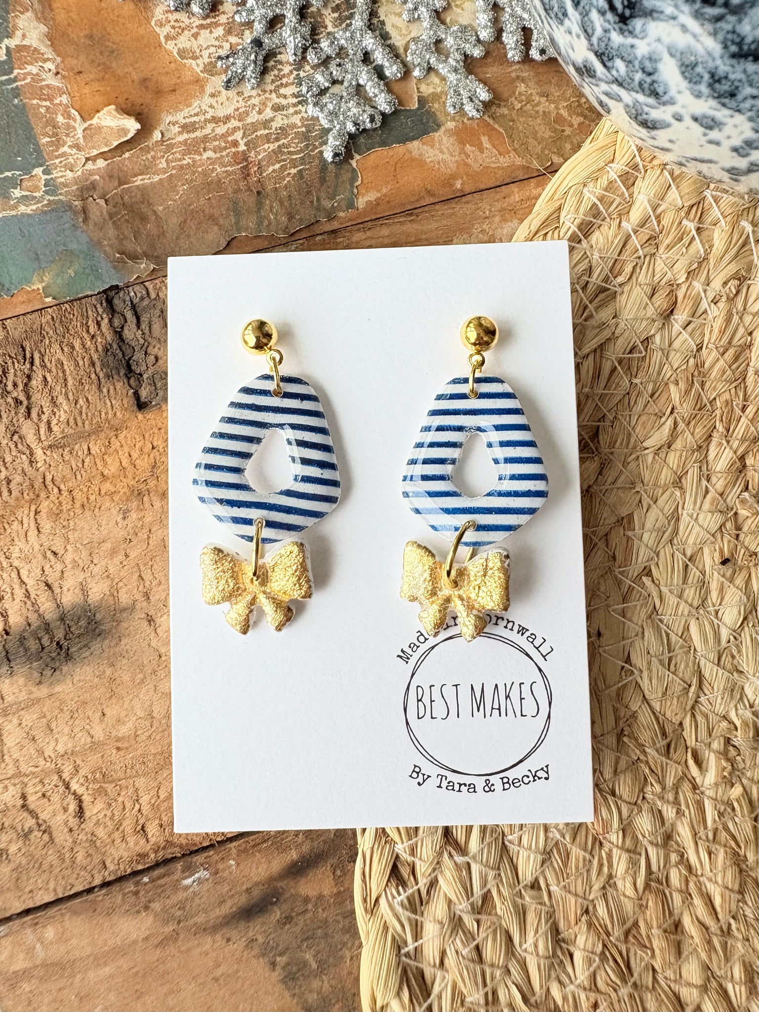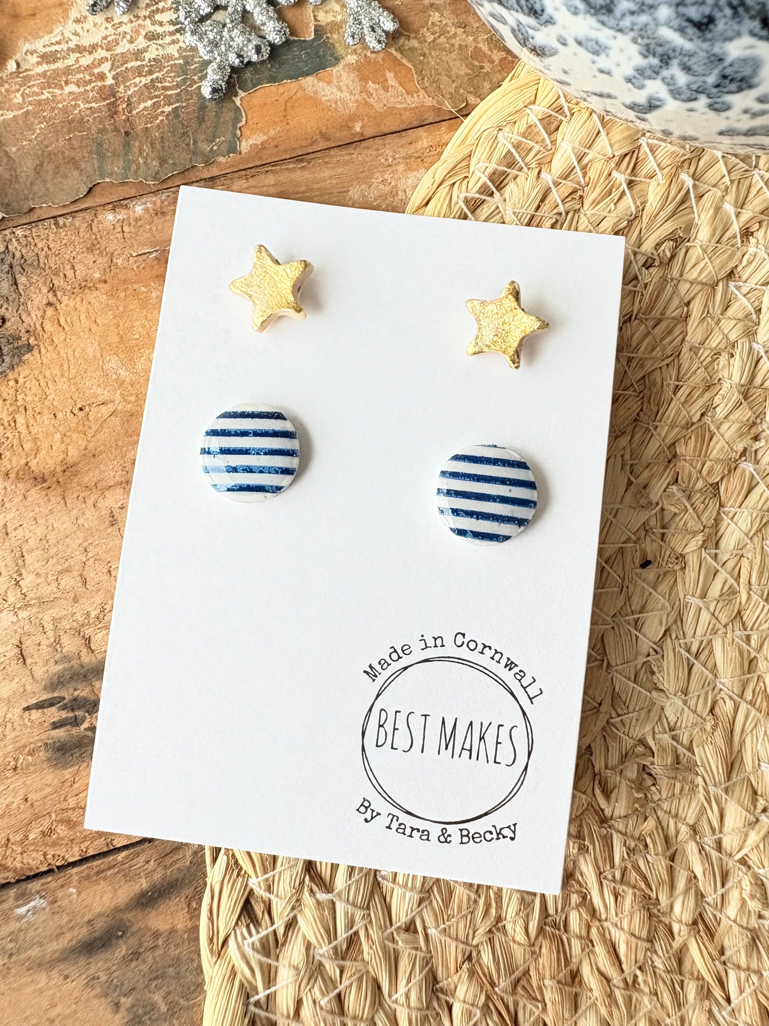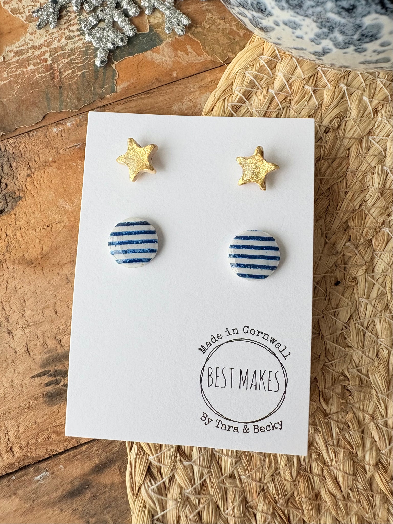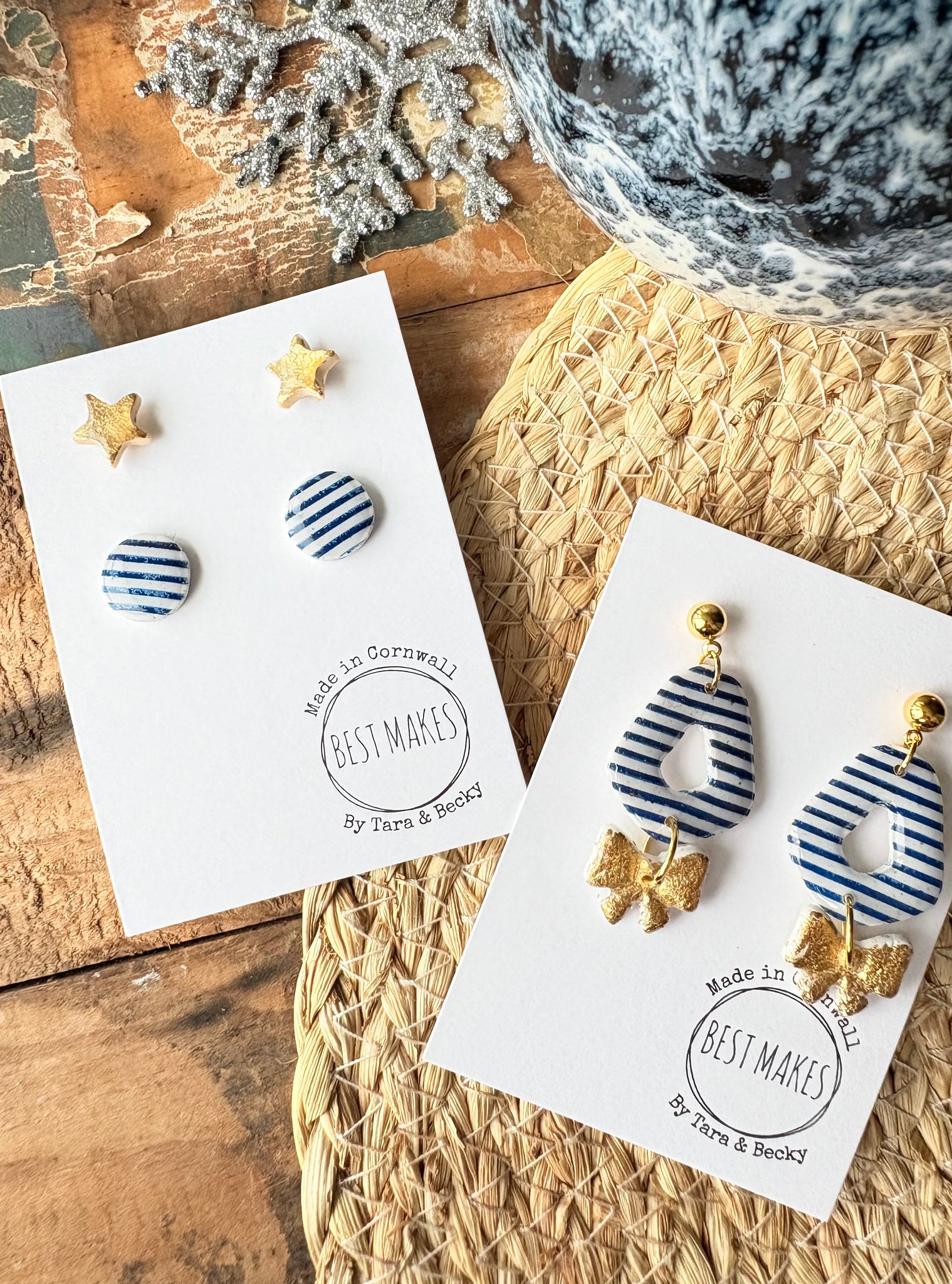 Celebrate the season with seaside charm! These clay cuties feature crisp nautical stripes topped with gold-plated ball studs for a festive look with a breezy coastal twist. Holiday cheer, but make it beachy. 🌊✨